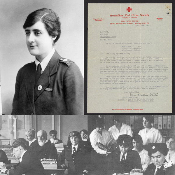 In October 1915, Miss Vera Deakin, daughter of ex-Prime Minister Alfred Deakin, established the Australian Red Cross Missing and Wounded Enquiry Bureau in Cairo. The Missing and Wounded Enquiry Bureau was founded to handle the many thousands of enquiries from Australian families seeking information on wounded and missing soldiers during the First World War.