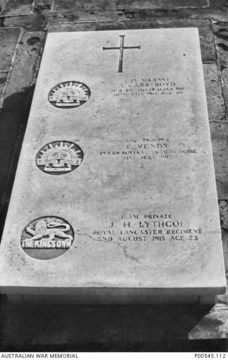 Trooper Frank Vendy, Service No 502 Australian LHR, was born 1890 at Landsborough, Victoria, Australia the son of Albert Edward Vendy aged 20. Frank was adopted as a young child by his maternal grandmother Louisa Vendy of Landsborough and bought up as part of her family. His father did subsequently marry in 1902 to a Alice Perry also from Landsborough and they had several children. However Albert died in 1918. Frank had been working as a saddler in Elmhurst, a small community close to Landsborough, shortly before WW1 broke out. He enlisted at Broadmeadows (Melbourne) on 26.8.1914 aged 24 years with the 4th Light Horse Regiment, C Squadron. On his Attestation papers he is described as having a fair complexion, with brown hair, blue eyes and 5’6” tall, single and Church of England. He listed his next of kin as his mother, Mrs. Louisa Vendy. Frank embarked per HMAT Wiltshire from Melbourne on 19.10.1914 and disembarked at Egypt. After some period the 4th LHR, was deployed without their horses to reinforce the infantry, and landed at Anzac Cove Gallipoli between 22nd and 24th of May 1915. On the 21st July 1915 while in action, Frank was severely wounded with a gunshot wound and fracture of the skull. Frank was admitted to the 1st Australian Casualty Clearing Station then evacuated to the Military Hospital at Valetta on Malta, where he died on 31st July, 1915 aged 25. A telegram advising of Frank’s death was sent to Louisa Vendy. Sadly, a telegram was received back from Reverend Esperon of Landsborough stating “Mrs Vendy dead. Was too ill to tell son’s death”. Louisa died at Landsborough on the 8th August aged 78 only knowing that he had been injured. Subsequently his medals were collected by his uncle Alfred Vendy of Landsborough. Note: Buried with Adair CARR-BOYD, Sergeant, 1725, 2nd Battalion, Australian Infantry. Died of enteric fever, 30th July 1915, aged 29 years. The son of John Adair Carr-Boyd and Rose Anna Carr-Boyd, of Argyle Cottage, Belgravia, Inverell, New South Wales. Born at Glen Innes, New South Wales.