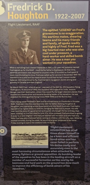 Fred enlisted in World War II from his home at 159 Galatea Street in Charleville. He was a bomb aimer and awarded the DFC. His love of country and adventure drome his desire to serve. After returning from the war, he and his beloved wife Joan (buried beside him 'A Woman of Grace and Substance') raised six children. He passed away at his home in Galatea Street, on 2 February 22007. Family Man, War, Hero, Legend....