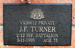 Private James Frank Albert Turner (Service No:VX36612) enlisted in the AIF on 8 July 1940 and was posted to No 2 Training Battalion and then 18 Infantry Training Battalion. Private Turner was attached to 2/12 Infantry Battalion on 5 February 1941 when he embarked with his Unit from Melbourne for Palestine. On 18 May 1941 he was reported MiA at Tobruk when his position was over-run by the enemy. Confirmed a PoW (No:34412) in the Italian List on 14 October 1941, Private Turner was interned at Camp Derna, Camp 57, Stalag VIII and Camp 59, and assigned a new PoW No:33671. Recovered and returned to England on 26 May 1945, Private Turner embarked for Melbourne on 2 October 1945 on board the Otranto and was hospitalised in Melbourne. He was attached to 2/12 Infantry Battalion at Discharge on 30 January 1946.
