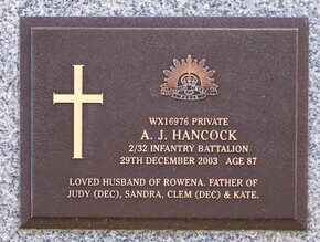 Youngest of four brothers (Harold, Ernie and Archie) who served in WWII, Lance Corporal Alexander John Hancock (Service No:WX16976) enlisted in the AIF on 10 October 1941, as a Private attached to 1st and 3rd Training Battalions. Private Hancock served with 2/32 Battalion in the Middle East (6 September 1942 - 18 February 1943) and New Guinea (7 August 1943 - 7 February 1944). Promoted to Lance Corporal, he served with 2/1 Guard Regiment in 1944, and was attached to 2/32 Battalion at Discharge on 5 May 1945.