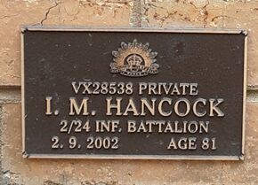 Private Ivor McLelland Hancock (Service No:VX28538) enlisted in the AIF on 19 June 1940 and was posted to 2/40 Battalion. On 15 November 1940, Private Hancock was attached to 2/24 Battalion when he embarked with his Unit from Melbourne for the Middle East. Reported Missing at Tobruk on 1 May 1941, Private Hancock was confirmed a PoW (No:26647) on 11 July 1941, and was interned at Bengazi (Libya; May - December 1941; War Work), PG (Campo) 57 and PG (Campo) 106 in Italy (1943; Railway and Farm Labour), Stalags IV B, F and G (Germany; 1944/1945; Railway and Benzin Refinery Labour). Private Hancock made an escape in Italy, but was recaptured by Fascists in Switzerland. Recovered from Germany on 7 May 1945, Private Hancock was evacuated to England, embarking from there for Melbourne on 6 October 1945, and was attached to 2/24 Battalion at Discharge on 8 October 1946. His father Harold served in WWI and WWII, and younger brother Billy served in the RAAF in WWII.