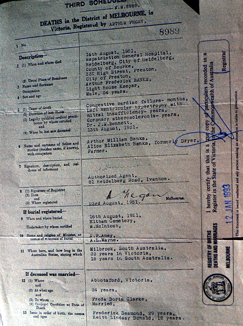 Died: | Congestive Heart Failure (months). Left Ventricular Hypotrophy with Mitral insufficiency (years). Coronary atherosclerosis (years), Heidelberg, Victoria, Australia, 14 August 1951, aged 54 years |