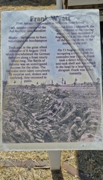 Private Frank Wyatt was killed in action in France on 11th August last. He was a resident of Forbes for four or five years, and made great many friends. He was a member (violin) of Acret's orchestra, and resided with Mr J. Jeffries, across the river towards Wowingragong. Private Wyatt enlisted at Townsville, but with other Queensland troops sailed from Melbourne on 21st November, 1917, being then an Acting Lance-Corporal. While at the front he was a Lewis gunner.