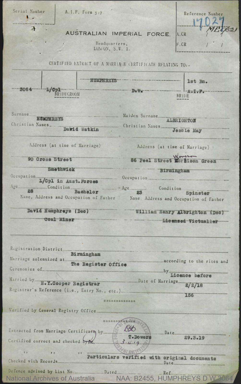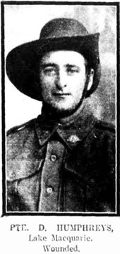 Born at Merewether (Glebeland), New South Wales on the 28th March 1888 (as David M HUMPHRIES) to David (died 1890) and Elizabeth Ellen Humphreys (remarried as CLEAVER, 1892, Gosford, N.S.W., died 1943, Belmont, N.S.W.); husband of Jessie May Humphreys nee Albrighton (married 2.2.1918, at the Register Office, Birmingham, England, died 1973, age 79, 35 years a widow, sleeping here), David enlisted July 1915 at Sydney, N.S.W.