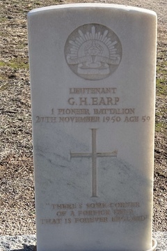 594/Lieut G.H. Earp enlisted as a Private 17 Aug 1914 in Melbourne aged 23. Place of birth Maryborough, New Zealand. Departed Aust as part of 5th Bn AIF on HMAT A3 on 21.10.14. Landed on ANZAC on day one, 25.4.15. Admitted to No2 Field Ambulance, ANZAC 5.7.15 (Sick), transferred to a Fleetsweeper 5.7.15 and taken to Hospital on Mudros Island. Transferred to Egypt on HMT 'Southland'. Leave Egypt for return to Gallipoli 26.10.15 on HMT Canada. Rejoined 5Bn 1.11.15 on Gallipoli. Evacuated. Depart Alexandria for France on HMT 'Ballarat' 26.3.16. Promoted 2/Lieut 11.4.16. Transferred to 1st Pioneer Bn AIF in France 14.4.16. Remained serving in France and the UK until departing for home in 1919 on 'Kashmir' as ship's subaltern. A copy of a letter exists in Lt Earp's service file which he wrote to the Red Cross in 1915 in which he asks the Red Cross to notify the families of two of his mates, who were shot at the landing as they lay on the beach beside him at approx 4.30PM, as to the circumstances of their deaths. They were 580 Pte/L.cpl H. Hodgman 5Bn (Mortlake, Vic) and 610 Pte R.C. Brownell 5Bn(New Town, Hobart, Tas. George Earp lived the majority of his post war life at Glenrowan, Victoria. He died on 27.11.1951 and is buried at Wangaratta.