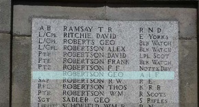 A George Robertson is remembered on the Carnoustie War Memorial; not all war memorials commemorate those who gave their lives. Carnoustie is a town and former police burgh in the council area of Angus, Scotland. It is at the mouth of the Barry Burn on the North Sea coast. Carnoustie can be considered a dormitory town for its nearest city, Dundee, which is 11 miles (18 km) to the west.