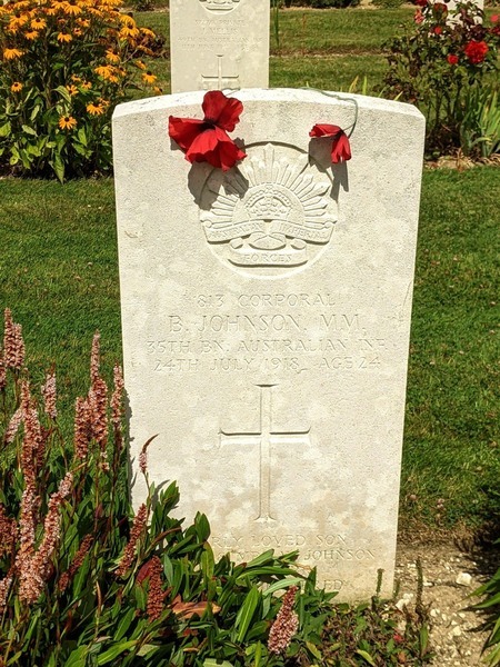 On the 24th July 1918, Corporal Bartholomew Johnson M.M., referred to as Bart, 35th Battalion (Reg No-813), bread carter (Kurri Kurri Co-Operative Store), from Barton Street, Kurri Kurri, New South Wales, was Killed in Action at Hamel, France, age 24 years 4 months. Cause of death unknown.