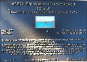 Private Walter Gordon Ibbott, Service number 6570, embarked from Melbourne, Victoria on HMAT Port Lincoln (A17) on 20th October, 1916 with the 12th Infantry Battalion, 21st Reinforcements. He was transferred to HMAT Ascanius (Note: The Casualty Form – Active Service recorded he transferred to “A11 Ulysses” which is incorrect. A11 was Ascanius) at Sierra Leone on 4th December, 1916.