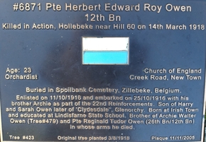 Herbert was one of the three sons of Harry Robert and Sarah Owen, of New Town, Tasmania, who all enlisted in the 12th Infantry Battalion. He was known as ‘Roy’ to his family and friends.