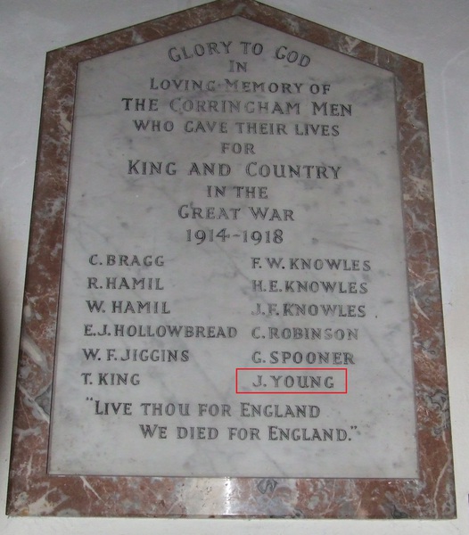 He is commemorated on the Roll Of Honour at Corringham St.Mary the Virgin Church, on the war memorial at Chadwell St Mary Churchyard, and on the family grave at Grays New Cemetery.