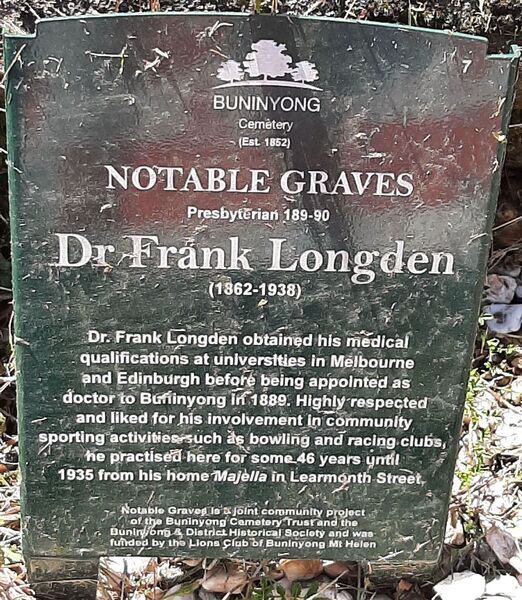 Dr. Frank Reginald Longden, the oldest medical practitioner in the district, died on Tuesday night at his home at Buninyong where he practised for more than sixty years. He was 80 years of age. For many years he was health officer to Buninyong shire. He was a keen lover or sport, particularly horse racing, and was a noted billiard player. One of his sons is a doctor at Ballarat. The funeral at the Buninyong Cemetery yesterday was attended by many mourners including doctors and sportsmen.