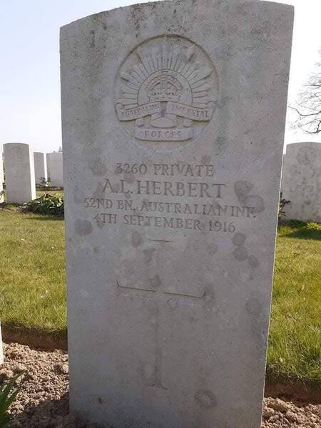 "No 3260 Private A. L. Herbert 52nd Battalion (late 12th) who was previously reported missing, is now reported to have been killed in action in France on September 4, 1916. The deceased soldier enlisted at Millicent, and sailed from Australia on October 27, 1915. He under-went training in Egypt, and then went on to France. The last letter received from him by his relatives must have been written a few days before his death. The late Private Herbert was 23 years of age. He was born at Terowie, but had lived at Millicent with his uncle (Mr J. Warr) since he was 10 years of age. He was a much loved member of the household, and was an industrious and clean-living young man. The official news of his death was received on Tuesday, by his sister Mrs D. Randall, of Tantanoola."