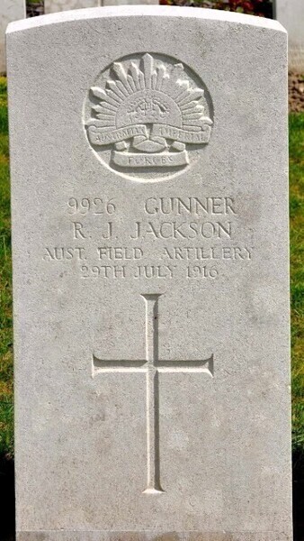 His brother, 609 Bombardier Claude William Jackson 36th Australian Heavy Artillery Group, was later killed in action in Belgium on 4 October 1917.