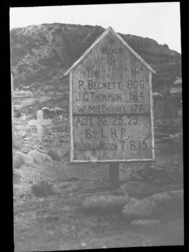 7 Aug 1915: | Involvement Trooper, 806, 8th Light Horse Regiment, ANZAC / Gallipoli, --- :awm_ww1_roll_of_honour_import: awm_service_number: 806 awm_unit: 8th Australian Light Horse Regiment awm_rank: Trooper awm_died_date: 1915-08-07 |