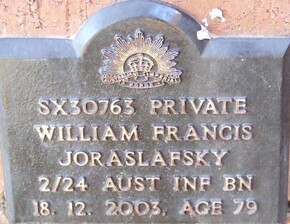 Private William Frances Joraslafsky (Service Nos:S1119000/SX30763) initially served in the ACMF with 18 Infantry Battalion from 11 January 1943 to 1 May 1943, and was 'in the field' at Battle Station NSW when he enlisted in the AIF on 2 May 1943. Private Joraslafsky was attached to 2/24 Infantry Battalion on 31 October 1943 when he embarked with his Unit from Townsville for Port Moresby, returning from Finschafen to Brisbane on 4 March 1944 on board the Sea Snipe. Private Joraslafsky served in Morotai and Tarakan (3 April 1945 to 9 March 1946) with 2/24 Infantry Battalion, 2/3 Pioneer Battalion and 1 Australian Press Unit. Private Joraslafsky was attached to 2/24 Infantry Battalion at Discharge on 5 September 1946.