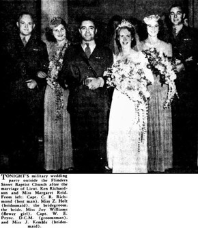 Wally was also instrumental in the marriage ceremony of Lieutenant Ken Richardson who had Captain Pryor D.C.M. as his groomsman and Captain C.R. Richmond as his best man when he married in April ’46.