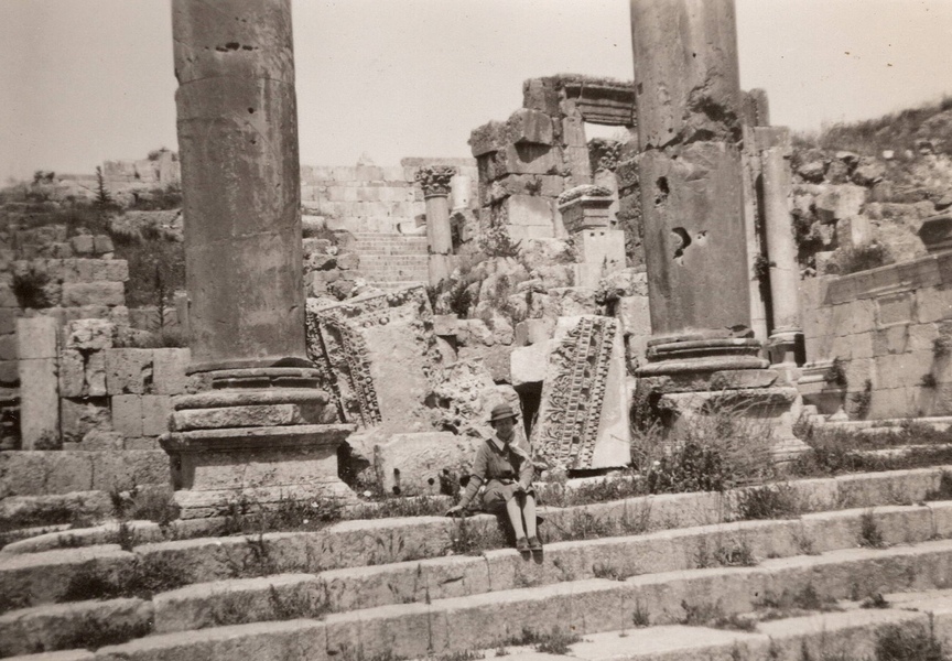 Accompanied by our armed escorts wherever we went, we climbed miles of rough rocks with their help. Our rubber soled shoes were a great help — we climbed, I think, as well as any goat could, but we puffed and panted a great deal more.[28]09a Kestel among the ruins of Jeresh (Trans Jordan), Aptil 1941 (See Photos)