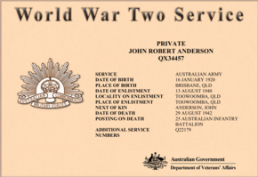 Memorials: | Australian War Memorial Roll of Honour, Toowoomba Roll of Honour WW2, Toowoomba WW2 Roll of Honour Book, Toowoomba War Memorial (Mothers' Memorial) |