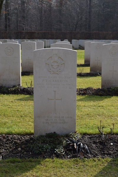 CAMERON.—Presumed dead, missing after air operations on Duisburg, Germany, May 22, 1944, Flight Sgt. Peter Talmage Cameron, navigator, Lancaster bomber, eldest son of Mr. and Mrs. P. T. Cameron, Round Hill, Wivenhoe, and brother of George, Betty and John (deceased). Aged 23 years.