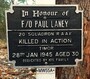 Eldest of four siblings who served in WWII, Flying Officer Paul Laney (Service No:427520) enlisted in the RAAF on 19 July 1942 at No 4 Recruiting Centre Perth as an Aircraftman I, and by December 1943 was a Flying Officer attached to 73 Squadron. In 1944 F/O Laney served with 67 and 11 Squadrons, and was posted to the Northern Territory - 54 Mile in October. F/O Laney was in Darwin attached to 20 Squadron by November 1944, and on 28 January 1945 was reported Missing (presumed KiA) during a mine laying mission in the Lacet Straits (on Catalina A24-204).