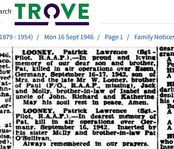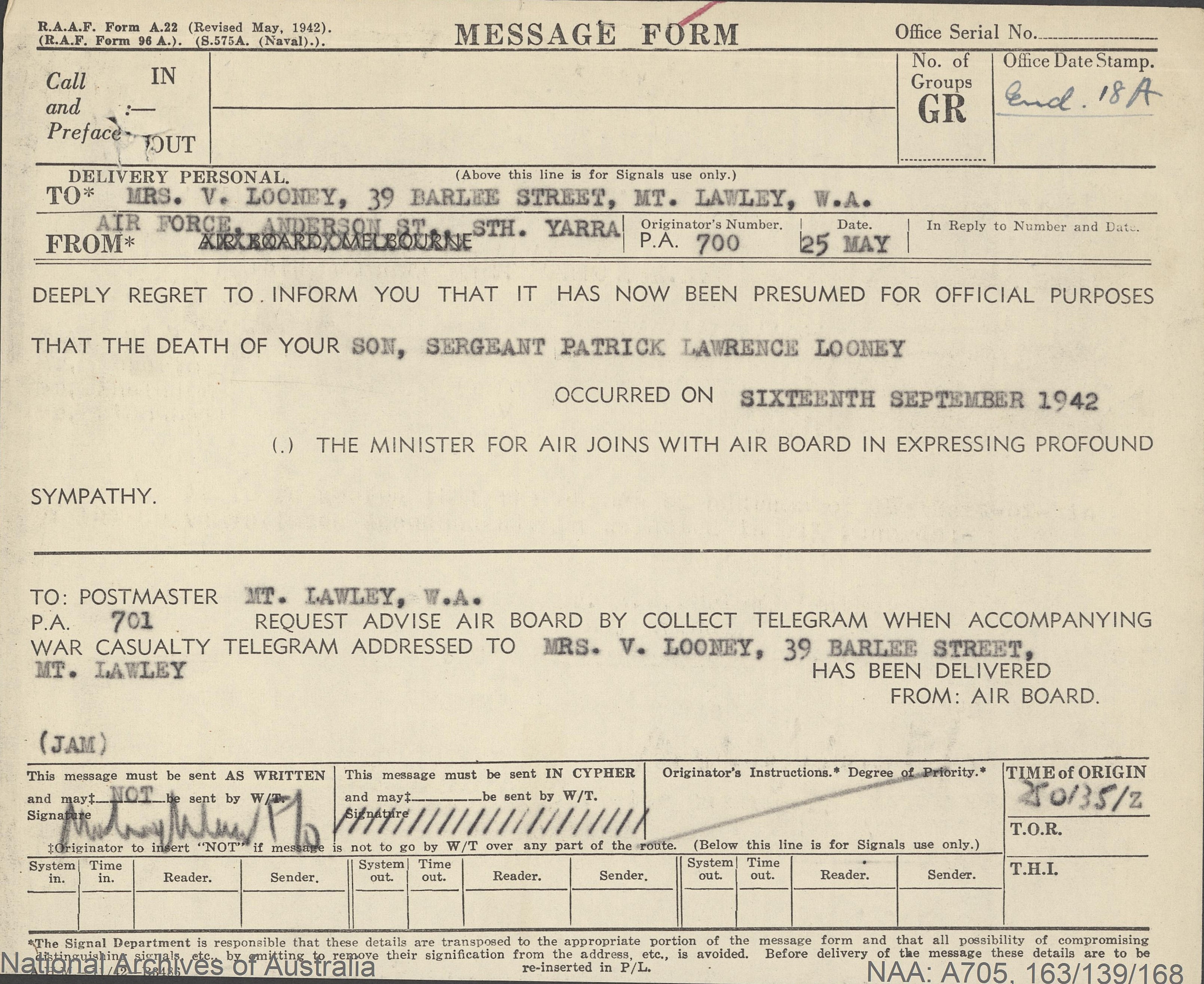 Victoria Agnes Looney of Mt Lawley was notified via a Telegram on 25 May 1943 that her son was now presumed dead for "Official Purposes". His death was presumed to have occurred on 16 September 1942.