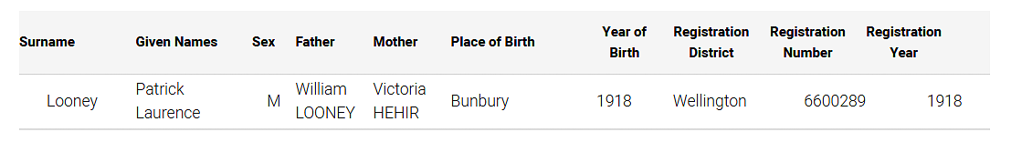 His 1918 WA Birth Registration Records confirm that Patrick's full legal name is Patrick Laurence Looney - not Patrick "Lawrence" Looney.