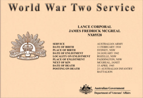 24 Jan 1942: | Enlisted Australian Military Forces (WW2) , Lance Corporal, NX85528, 2nd/1st Infantry Battalion |