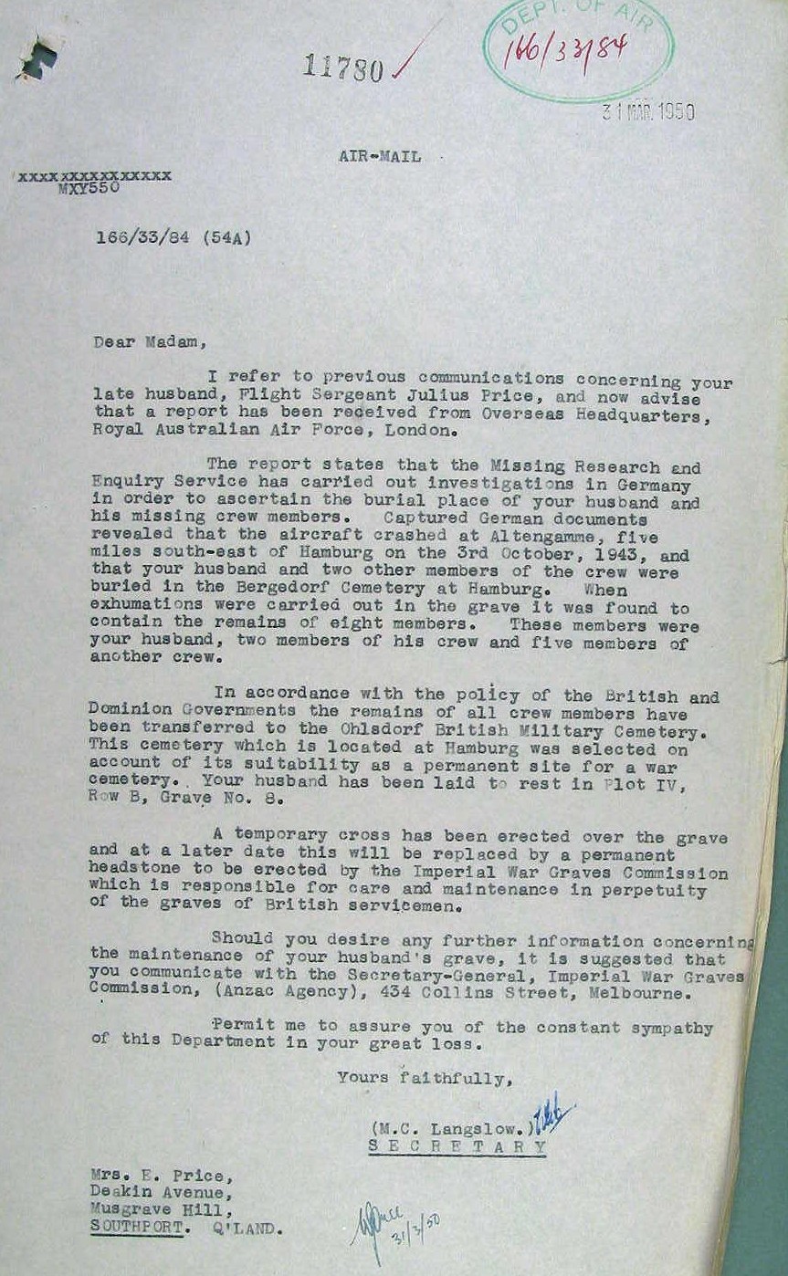 Memorials: | Australian War Memorial Roll of Honour, International Bomber Command Centre Memorial |
