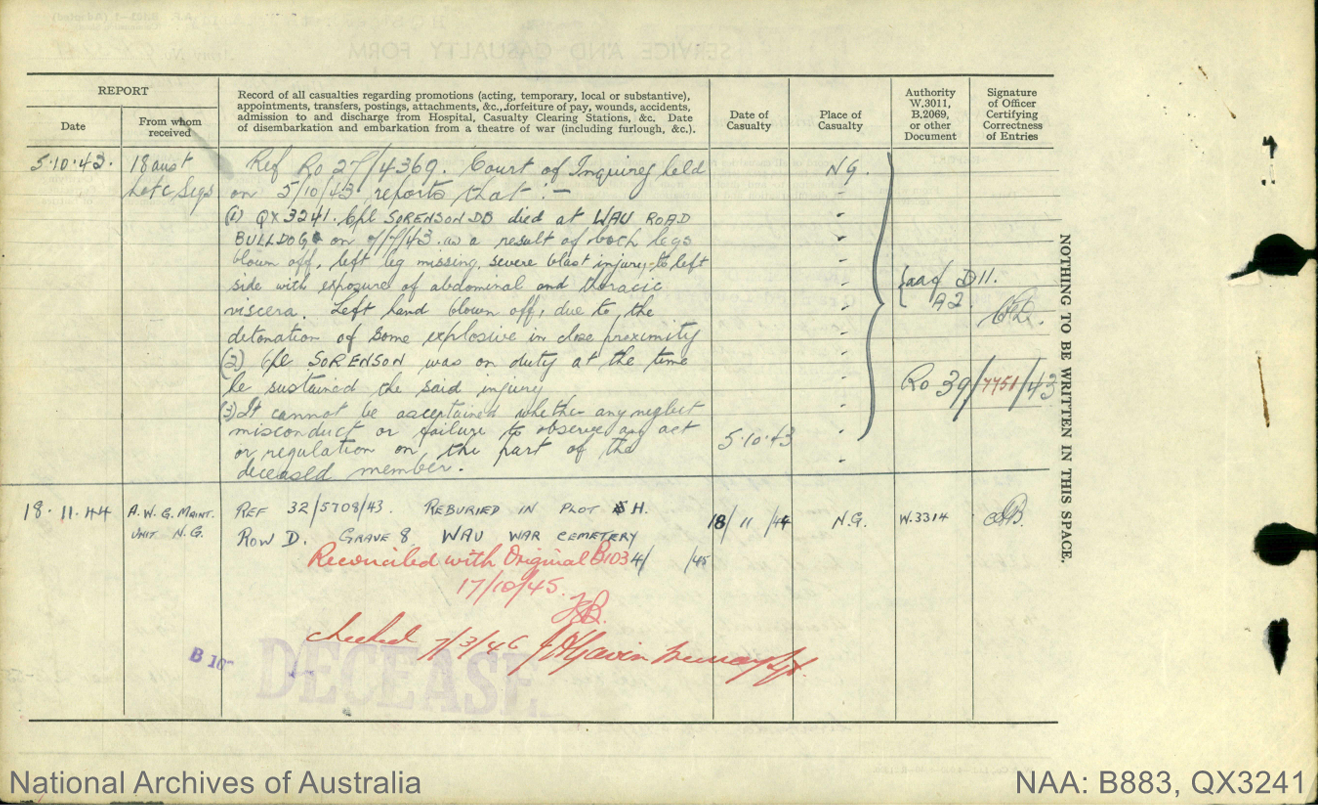 2 Dec 1942: | Involvement Australian Military Forces (WW2) , Corporal, Lines of Communication Signals, Posted to New Guinea Lines of Communication Signals. Accidentally killed by unknown explosion, Wau Road, Bulldog, New Guinea. | |