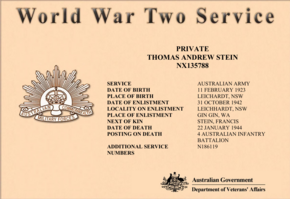 31 Oct 1942: | Involvement Australian Military Forces (WW2) , Private, 4th Infantry Battalion, Transferred from the Australian Military Forces (AMF) to the Australian Imperial Force (AIF) with the service number NX135788. Assigned to the 4th Australian Infantry Battalion. Killed in action on 22nd January 1944 in New Guinea. | |