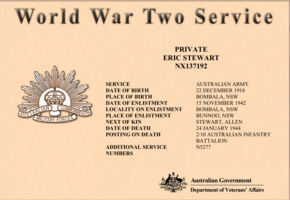 15 Nov 1942: | Involvement Australian Military Forces (WW2) , Private, 2nd/10th Infantry Battalion, Transferred from the Australian Military Forces (AMF) to the Australian Imperial Force (AIF) and assigned service number - NX137192. Assigned to 2/10th Australian Infantry Battalion. Killed in action, New Guinea. | |