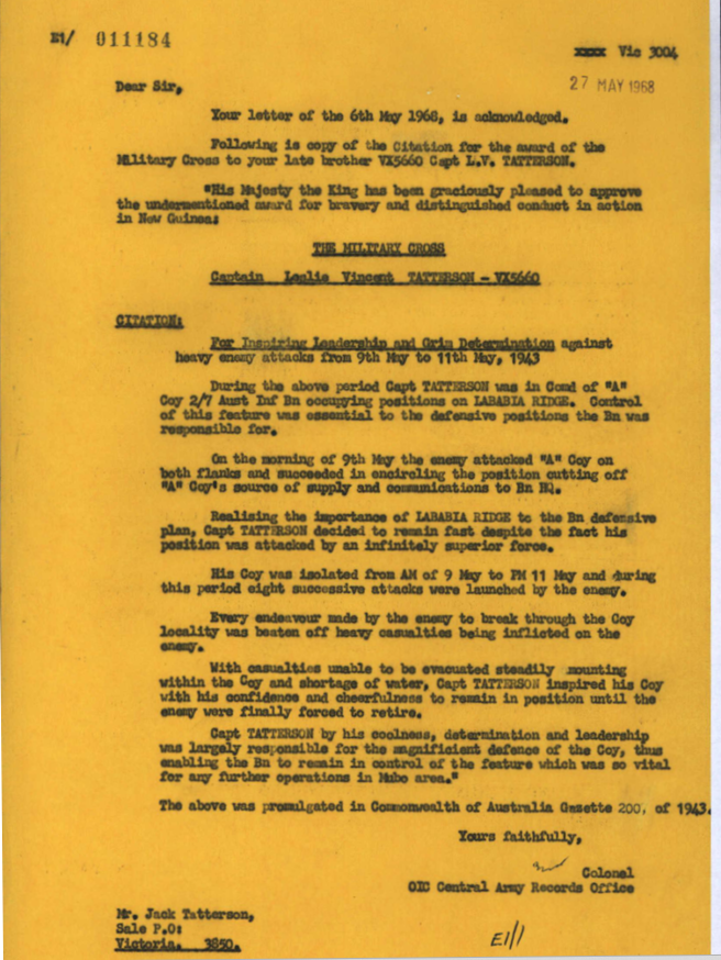 11 May 1943: | Honoured Military Cross, Inspiring leadership and grim determination, Lababia Ridge, Mubo, New Guinea. |