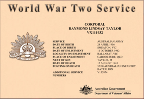 11 Oct 1942: | Involvement Australian Military Forces (WW2) , Corporal, 57/60 (amalgamated) Infantry Battalion AMF, Transferred from the Australian Military Forces (AMF) to the Australian Imperial Force (AIF) and assigned service number -VX111932. Died of wounds 15th August 1943, New Guinea. | |