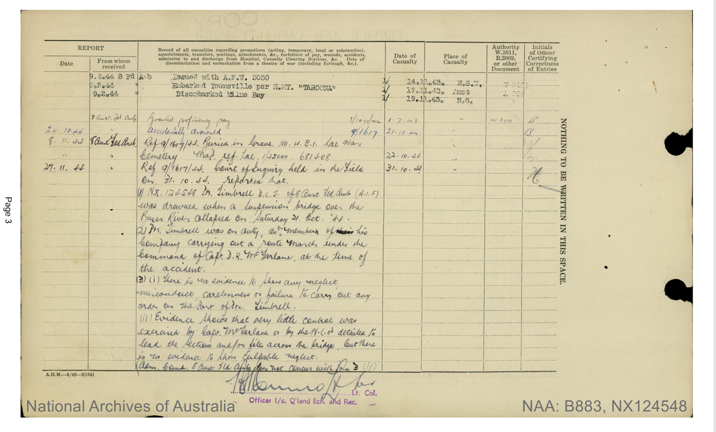 13 Jan 1943: | Involvement Australian Military Forces (WW2) , Private, 8 Field Ambulance AMF, Assigned to the 8 Field Ambulance on January 13, 1943. Tragically drowned on October 21, 1944, when a suspension bridge over the Buser River in New Guinea collapsed. |