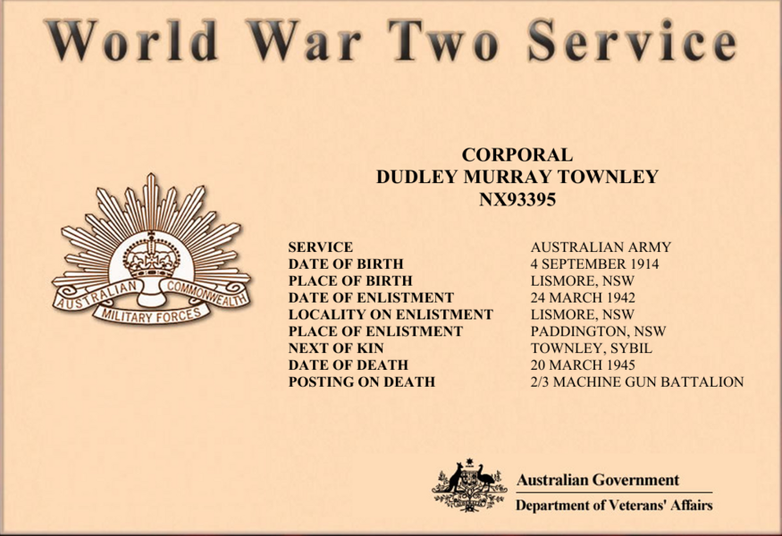 20 Jul 1942: | Involvement Australian Military Forces (WW2) , Corporal, 2nd/3rd Machine Gun Battalion, Posted to 2/3 Machine Gun Battalion on 20th July 1942. Killed in action in New Guinea on 20th March 1945. |