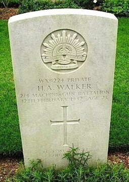 Private Harold Alexander Walker (Service No:WX9224) enlisted in the AIF on 30 October 1940 and was posted as Signaller with HQ Company. Private Walker was attached to 2/4 Machine Gun Battalion on 12 February 1942 when he was KiA in Singapore.