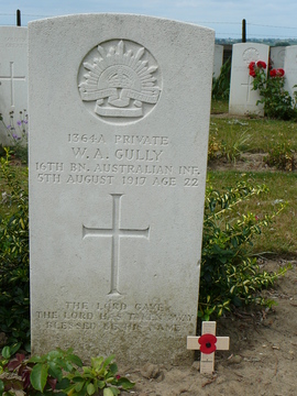 With 16 Battalion. In Gallipoli, May, 1915. In France, June, 1916. Between 9-11 August, 1916, 16 Battalion took part in the advance from Pozieres towards Mouquet Farm. On 10 August William suffered a gun-shot wound to the right forearm, near Ration Trench, between Pozieres and Mouquet Farm, while attacking the German Circular Trench. Medivaced to England on 22 August, 1916. Rejoined the battalion on 3 May, 1917. Wounded in Action a second time on 11 June, 1917, while in action near Messines, with a gun-shot wound to the arm. He remained on duty. He was Killed in Action on 5 August, 1917. Most likely by German artillery. Buried at Messines Ridge British Cemetery.