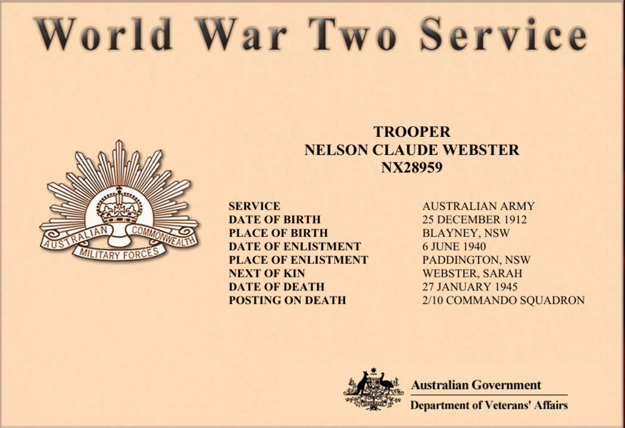 Mrs. Webster, of Orange, has received offical word that her only son Trooper Nelson Webster has been drowned whiel in action in New Guinea. Trooper Webster, prior to his enlistment was well and popularly known in Orange, and was employed at a local garage. He was a native of Forest Reefs and unmarried.