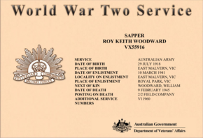 15 Jun 1943: | Involvement Australian Military Forces (WW2) , Sapper, 2nd/2nd Field Company / Squadron RAE, Posted to 2/2 Field Company. Died of injuries, New Guinea. |
