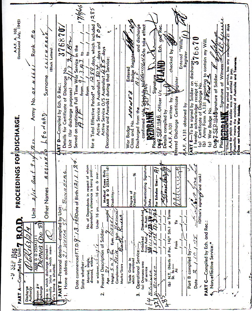 17 Sep 1946: | Discharged Australian Military Forces (WW2) , Private, QX46661, 2nd/13th Infantry Battalion |