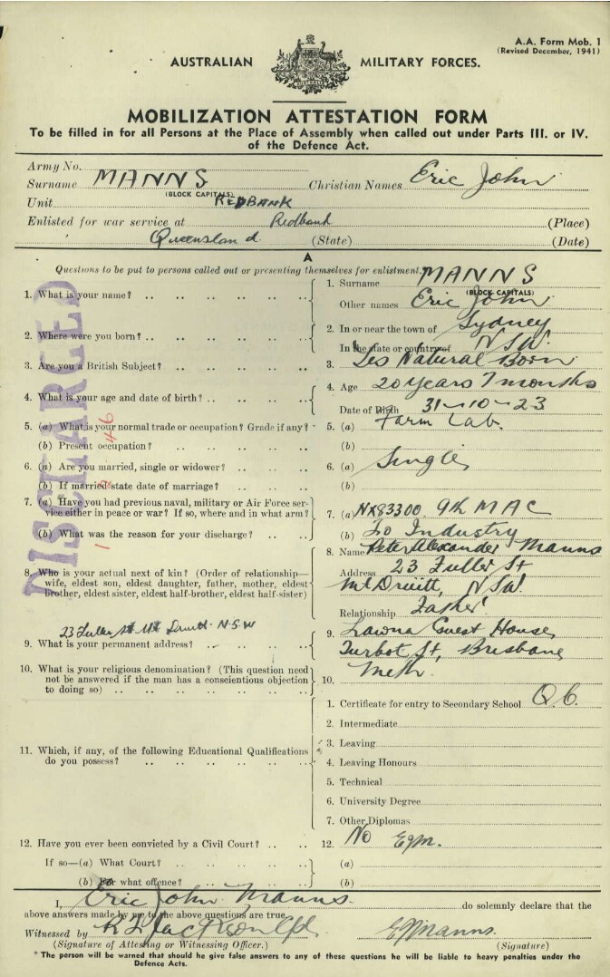 2 Jun 1944: | Enlisted Australian Military Forces (WW2) , Private, QX60155, 2nd/25th Infantry Battalion | |