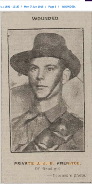 JJB Prentice was one of three brothers to enlist during WW1. JJB was 19 when he enlisted and was involved in the Gallipoli disaster as we now know it. In May 1915, JJB was preforming his duties and was shot by a sniper. The bullet entered behind his ear and penetrated and exited his jaw causing considerable damage. He was listed as critical and moved to a hospital ship, then initially Egypt before recovering in England. JJB's war was over.