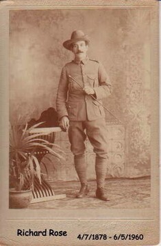 Trooper Richard John Rose (Service No:205) enlisted in the 3rd Troop (Wallaroo) 8th Battalion Australian Commonwealth Horse in mid 1901 and embarked from Port Adelaide for Durban on 26 May 1902 on board the St Andrew. Hostilities having ceased, the contingent embarked from Durban for Port Adelaide on 1 July 1902 on board the Manchester Merchant. The contingent was disbanded on 9 August 1902.
