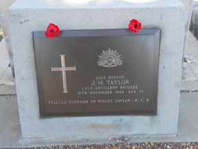Born at Sunderland, Durham, England about 1890 to Matthew and Margaret Taylor of Hawk Terrace, Portobello Way, Birtley, United Kingdom; husband of Violet Harriet Taylor nee Williams (married 1925, Hamilton, N.S.W., died 1993, sleeping here), Joseph enlisted on the 27th August 1914 with the 1st Australian Divisional Ammunition Column at Sydney, N.S.W.