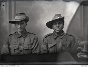 Edward Higgins photograph can be found within the Thuillier Collection, and on page 193 of ‘The Lost Diggers’ by Ross Coulthart. Edward has chosen to have his portrait taken with his mate, an Aboriginal Australian soldier, as yet unidentified. Both men have a band on their right arms indicating that they are part of a three man trench mortar team. The trench mortal teams as well as the 13 Brigade Machine Gunners drew men from all infantry battalions (49th, 50th, 51st, 52nd Battalions) in the 13 Brigade.